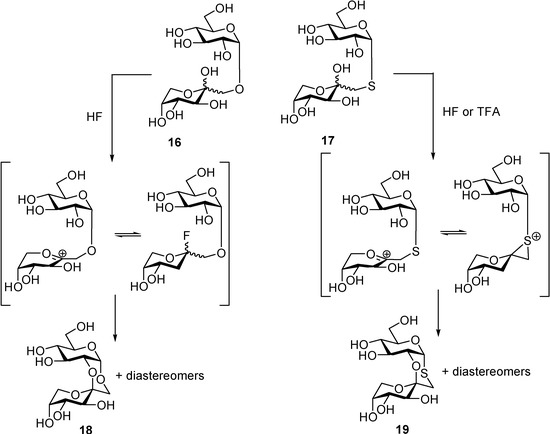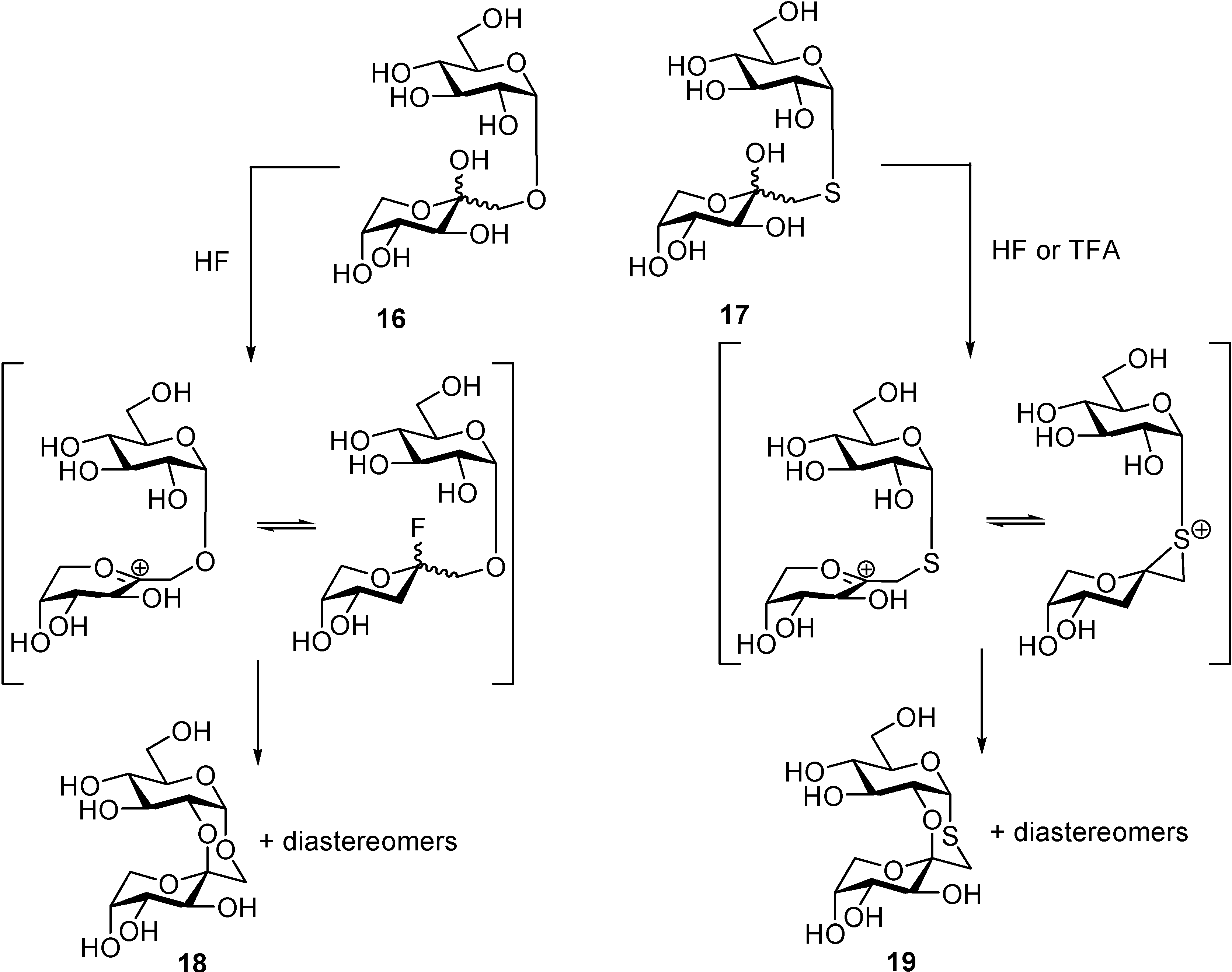 High-yielding preparations of DFAs have been previously achieved by protonic activation of d-fructose, fructooligosaccharides, sucrose or inulin with anydrous hydrogen fluoride (HF) or its complex with pyridine [60,61,62]. HF is an excellent solvent for carbohydrates and a non-dehydrating, strong protonating reagent capable to activate selectively the anomeric position of the sugar precursor. In certain circumstances, the fructosyl oxacarbenium intermediate might be in equilibrium with the corresponding glycosyl fluoride, itself a powerful glycosyl donor [63]. The use of HF has been successfully extended to promote spiroketal formation also from fructose-derived thiodisaccharides such as 1’-thiotrehalulose (17) [64]. In this case, a much higher intramolecular spiroketalization rate was observed as compared with the corresponding glucosylfructose trehalulose (16). Spiroketalization could be efficiently promoted even by using much less strenuous conditions, e.g. 9:1 trifluoroacetic acid-water, supporting the involment of transient episulfonium intermediates at the anomeric position, instead of the fructosyl fluoride, as the active species (Scheme 2).