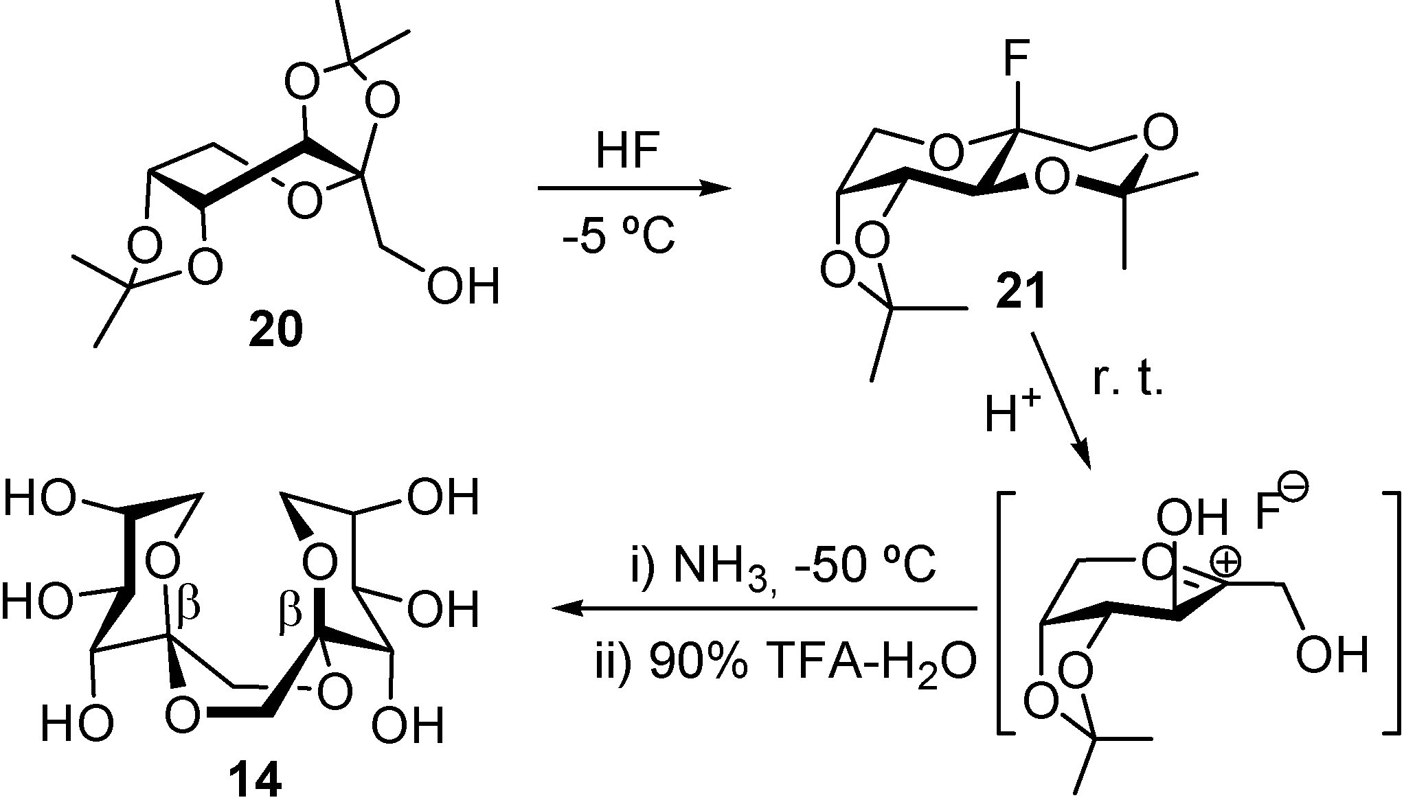 Hydrogen fluoride-promoted stereoselective synthesis of di-d-β fructopyranose-1,2’:2,1’-dianhydride (14).