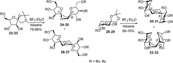 In the case of participating protecting groups, the authors propose a reaction mechanism involving acyloxonium intermediates. In the furanose series, the formation of a 2,3-acyloxonium species would block the β-face of the monosaccharide, favouring the formation of the C2-symmetric α,α-isomer. In fructopyranose derivatives, the 2,3-acyloxonium is probably in equilibrium with a 2,5-acyloxonium intermediate. While the first one would direct glycosylation and spiroketalization to form α-linkages, the second would lead to the opposite anomer. As a result, a 1:1 mixture of the dissymmetric (α,β) and C2-symmetric (β,β) diastereomers is obtained (Figure 8).