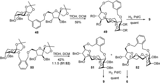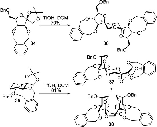 A comparative analysis of the conformational behaviour of the fructose moieties in dispirodisaccharides revealed that in α-configured rings the hydroxyl groups at C-3 and C-4 adopt a diaxial (or pseudodiaxial) disposition, while in the β-configured counterparts they prefer a diequatorial (or pseudodiequatorial) orientation (Figure 10). The insertion of a cyclic o-xylylene group at this segment allows the remote control of the stereochemistry during spirocyclization. Thus, triflic acid-promoted dimerization of the furanose derivative 34 afforded exclusively the α,β type I DFA 36, while the pyranose derivative 35 afforded a 3:1 (β,β:α,β) mixture of the type III DFAs 38 and 37 (Scheme 5).