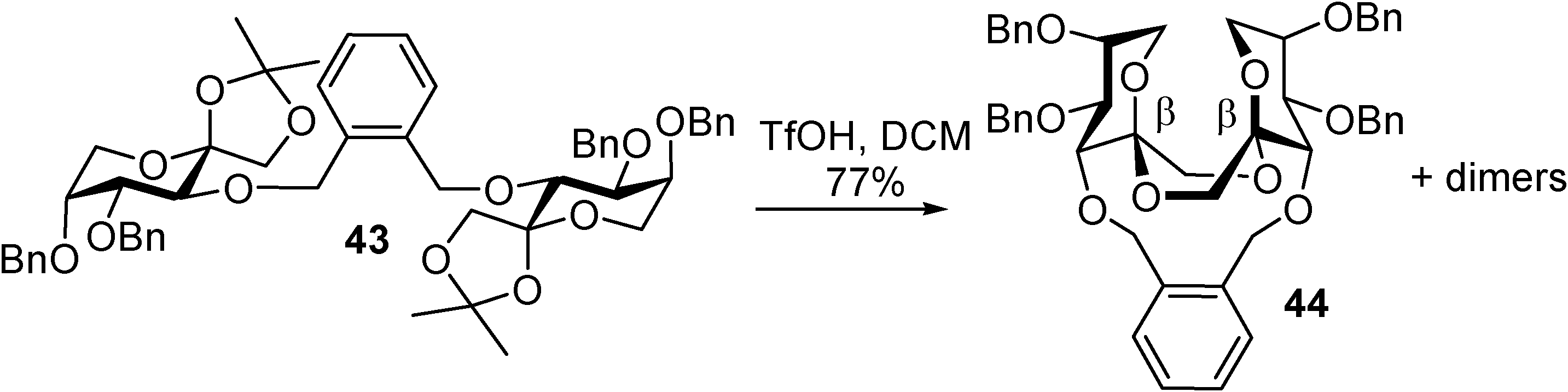 Considering the much shorter distance between the primary O-6 oxygens in the case of C2-symmetric difuranose DFAs, or between the O-3 oxygens in the case of C2-symmetric dipyranose DFAs, it was conceivable that the shortest o-xylylene tether would improve the stereocontrol for the contra-thermodynamic isomers upon spiroketalization, while the more flexible m-xylylene bridge should result in increased proportions of the thermodynamic counterparts. The hypothesis was validated both for the stereoselective synthesis of contra-thermodynamic type I (Scheme 6, Table 3) and type III (Scheme 7, Table 4) DFA isomers 42 and 44, respectively [89,90].