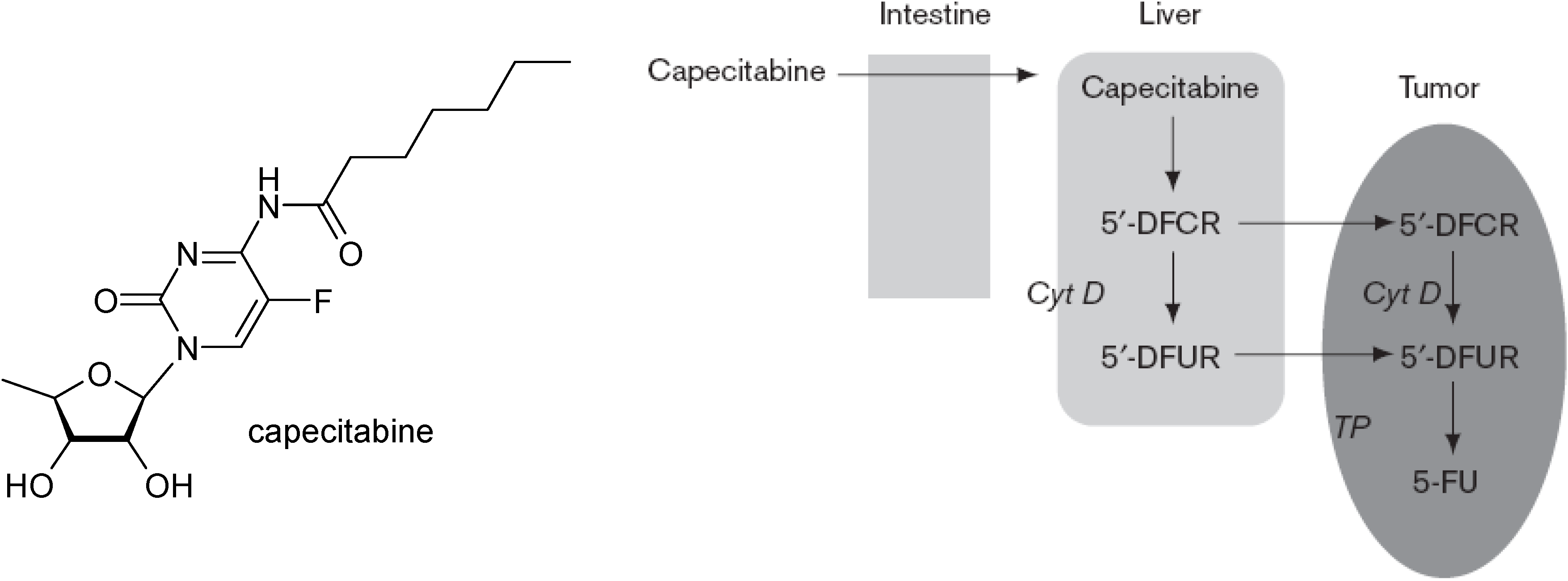 Another oral pro-drug that takes advantage of a different metabolic pathway to form 5-FU, is doxifluridine (5'-FdUrd; 5'-deoxy-5-fluorouridine). The enzyme thymidine phosphorylase is necessary to convert this pro-drug to its active form. Higher levels of this enzyme are expressed in tumour tissues and the intestinal tract, which is responsible for dose limiting toxicity evidenced by diarrhea [5,6]. Capecitabine is a carbonate derivative of 5'-DFUR that is absorbed through the intestine in pro-drug form. Three activation steps are necessary to metabolize capecitabine to its active form FU (Figure 1). Capecitabine is absorbed through the intestine and converted to 5'-deoxy-S-fluorocytidine (5'-DFCR) by carboxylesterase and then to 5'-deoxy-S-fluorouridine (5'-DFUR) by cytidine deaminase (Cyt D), both steps taking place in the liver. Finally, thymidine phosphorylase(TP) converts S'-DFUR to the active drug, FU. This occurs in both tumor and normal tissues; however, the enzyme is found at higher concentrations in most tumor tissue compared with normal healthy tissue. This theoretically allows a selective activation of the drug and low systemic toxicity [7,8].