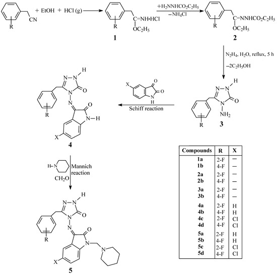 In the present study, ethyl imidate hydrochlorides 1 were prepared by passing HCl gas through solutions of o- or p-fluorobenzyl cyanide in absolute ethanol, followed by precipitation with ether. Ester ethoxycarbonyl hydrazones 2 were synthesized by the reactions of alkyl imidate hydrochlorides 1 with ethyl carbazate. Treatment of compounds 2 with hydrazine hydrate in water resulted in the formation of 3-o-fluorobenzyl-4-amino-4,5-dihydro-1H-1,2,4-triazole-5-one (3a) and 3-p-fluorobenzyl-4-amino-4,5-dihydro-1H-1,2,4-triazole-5-one (3b), respectively. The substituted 4-amino-4,5-dihydro-1H-1,2,4-triazoles 3 were condensed with isatin derivatives in the presence of a few drops of glacial acetic acid as a catalyst to produce Schiff bases 4 in rather good yields. Mannich base formation can take place at both the isatin and triazole NH protons, but it is known that the isatin NH proton is more active than the triazole one [32]. In addition, after the Mannich reactions, the 1H- NMR spectra of compounds 5 show NH proton signals at around δ 11.00 ppm, which correspond to a triazole NH, so we conclude that in the current study, Mannich bases were formed by condensing the acidic imino group of isatin with formaldehyde and piperidine, instead of the triazole NH proton (Scheme 1).
