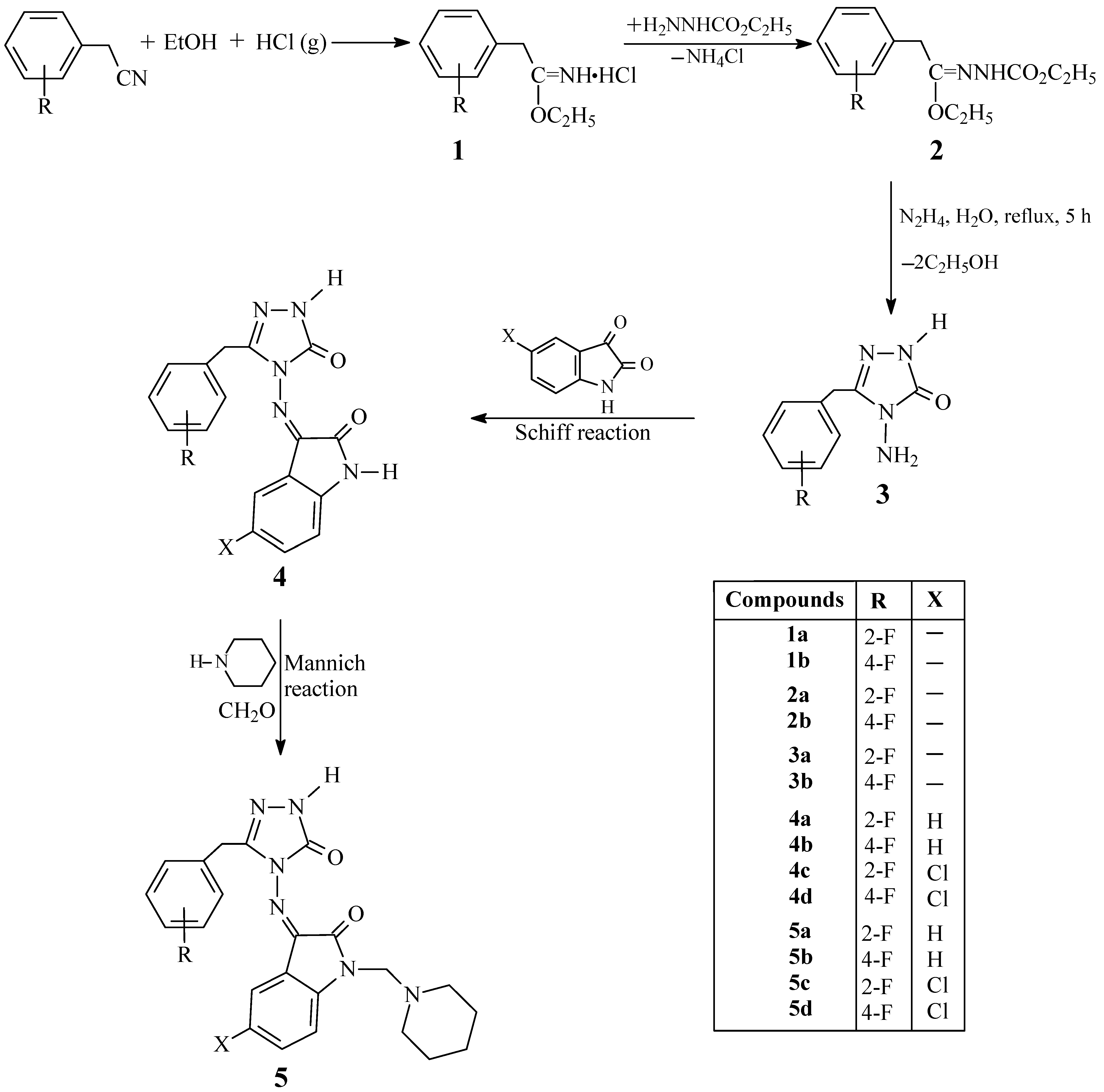 Ethyl imidate hydrochlorides 1 were prepared by passing HCl gas through solutions of substituted benzyl cyanides and absolute ethanol. Ethoxycarbonylhydrazones 2 were synthesized from the reaction of compounds 1 with ethyl carbazate. Treatment of 2 with hydrazine hydrate leads to the formation of substituted 4-amino-4,5-dihydro-1H-1,2,4-triazole-5-ones 3. Isatin and 5-chloroisatin were added to 3 to form Schiff bases 4 and N-Mannich bases 5 of these compounds were synthesized by reacting with formaldehyde and piperidine. Their chemical structures were confirmed by means of IR, 1H- and 13C-NMR data and by elemental analysis.