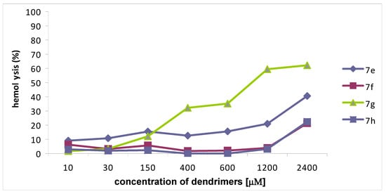 Selectivity of molecule-membrane interactions has been the main concern of numerous studies on biomedical applications of both multi-charged antimicrobial peptides [39,40] and dendrimers (PAMAM, PPI, etc.) [41,42]. Multiple positive charge and amphiphatic structure are proposed as a source of higher affinity of natural peptides to microbial versus human membranes [22]. In case of the title peptide dendrimers, the charge comes from the protonated amino groups of lysines (3 or 4) and two protonated ternary N-atoms from the core. Accumulation of positively charged groups in relatively small branched molecules should promote extended “carpet-like” conformations, facilitating multiple electrostatic interactions with microbial membranes composed mainly from acidic phospholipids (phosphatidylglycerol and cardiolipin). In contrast, outer leaflets of mammalian membranes are mainly composed from zwitterionic phospholipids (phosphatidylcholine and sphingomyelin) with only minor contribution of negatively charged species. Low impact of cationic compounds on red blood cells is regarded as an indication of a compound’s selectivity. In the present case, differences in hemolytic properties are observed within compounds belonging to the same series and even more pronounced between structurally different 7e-h and 10a-d series. Four-arm dendrimers 10a-d, [(+6) charge] containing four additional hydrophobic side chains from phenylalanine residues expressed higher antimicrobial potency associated however, with enhancement of hemolytic properties. Similarly, recent data on cationic, amphiphilic polymethacrylates revealed that lower mole fraction of hydrophobic groups is one of the important factors in design of potent, non-hemolytic antimicrobial polymers [43].