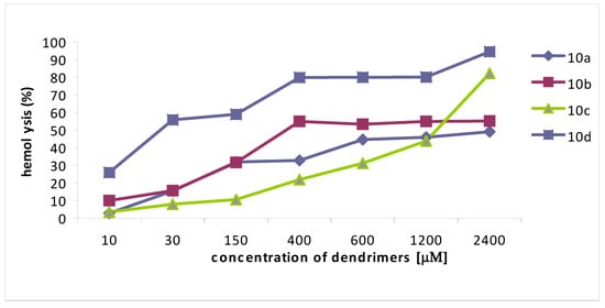 Dendrimers 7e,f,h characterized by the MIC values in the range 2.8-21.6 μM displayed less than 30% hemotoxicity up to a concentration 1,200 μM (extrapolated), whereas dendrimer 7g, exhibited 32% toxicity at a concentration of 400 μM (Figure 1). Compounds of the second series 10a,b,c characterized by MICs in the 1.3-54 μM range displayed 30% hemolysis at 400, 150 and 600 μM concentrations, respectively (Figure 2). Although hemotoxicity of the most potent compound 10d characterized by the MIC values in the range 1.7-14 μM reaches 25% in the region of antimicrobial activity. From this group of compounds the best antimicrobial activity against Candida genus and low hemolytic effect correspond to dendrimer 7g built around the smallest diaminopropionic acid core (DAP), and dendrimer 10a, that presents a similar antimicrobial profile and significantly lower hemotoxicity than compound 10d.