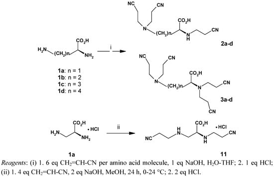 - McKinney, L.L.; Uhing, E.H.; Setzkorn, E.A.; Cowan, J.C. Cyanoethylation of α-amino acids. I. Monocyanoethyl derivatives. J. Am. Chem. Soc. 1950, 72, 2599–2603. [Google Scholar] [CrossRef]