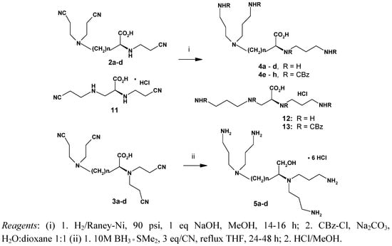 While catalytic reduction of the tris-N-cyanoethyl amino acids 2 in MeOH using Raney-Ni in a Parr hydrogenation apparatus gave the respective N-propylamino derivatives 4 in almost quantitative yields (Scheme 2), reduction of tetrakis-N-cyanoethyl derivatives 3 under the above conditions left 90% of the original substrate unconverted. Finally, a family of compounds 5 was obtained using three equivalents of 10 M borane dimethylsulfide complex per nitrile group with extention of the reaction time to 24-48 h (Scheme 2) [37].