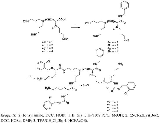 The synthesis of the lysine-functionalized first generation dendrimers 7e-h from the N-protected trimeric scaffolds 4e-h started with coupling with benzylamine, yielding the amides 6e-h. Then the amino group deprotection was followed by coupling with (2-Cl-Z)Lys(Boc) to afford 7e-h in 67-71% overall yield (Scheme 3).