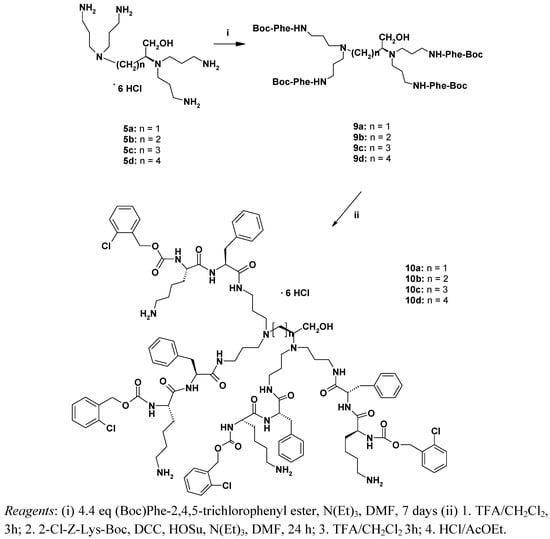 Synthesis of the tetra-functional branched compound using the hexahydrochloride of 5c as a starting material was complicated by the fact that 5a-d are practically insoluble in the commonly used organic solvents. Eventually, they were dissolved in hot DMF (50-60 °C) with addition of a large excess of triethylamine. In this case, coupling with 2,4,5-trichlorophenyl ester of (Boc)Phe was carried out for 7 days affording the compound 9a-d in 54% yield (Scheme 4).