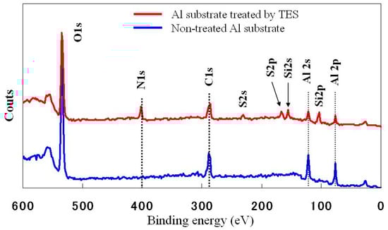 XPS wide scan spectra of the untreated and TES treated aluminum surfaces in 45 tilt degree. (X-ray anode: Al monochromated 2 nm filament; Aperture: 800 × 200 μm).