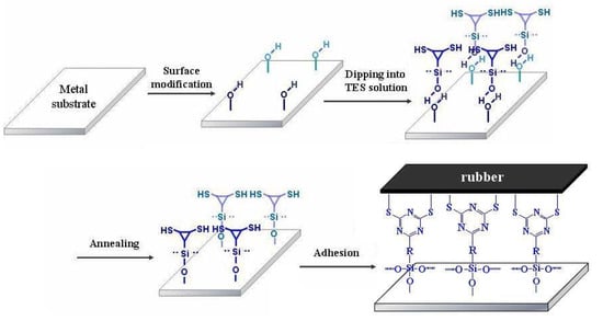 Obviously, this new method requires that the organic alkoxysilane interact with rubber and the metallic surface. The rubber first must be functionalized in order to bind with the silane. Secondly, the metallic surface must be oxidized to provide M-OH groups available to condense with the SiOH groups. Therefore, the metal is coated with an alkoxysilane solution of X-R-Si(OCH2CH3)3 (X being a functional group, i.e., NH2, S8, SH, etc.), and a condensation reaction occurs between M-OH and the Si-OH groups of the hydrolysed 6-(3-triethoxysilylpropylamino)-1,3,5-triazine-2,4-dithiol, leading to the formation of M–O–Si–R–X after loss of H2O. The group X is selected in order to interact with another group Y grafted to the natural rubber (NR–Y), and outstanding adhesion should be expected from the formation of covalent bonds (M–O–Si–R–X–Y–NR) between the two substrates. First experiments following this technology were described by Thiedman et al. []. Application of this technology for improving the adhesion of brass and zinc tire cords to rubber was proposed later by Van Ooij and co-workers [] who used bifunctional polysulfide organosilanes and found significant improvements in adherence. It should be noted that, these silane coupling agents were all long-chained silane alkyl hydrosulfide compouds deposited on the metallic substrates, and the metal pretreatments involved conventional methods. To date, the adhesion property of heterocyclic aromatic silane coupling agents was barely been reported.