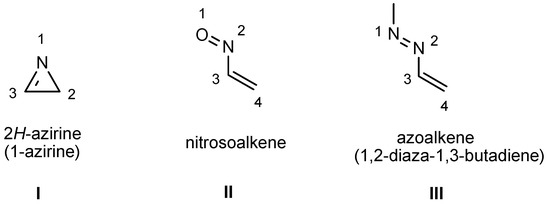 A common feature of all three structures is that they possess a highly electrophilic carbon centre (C-3 in 2H-azirines, C-4 in conjugated nitroso- and azo-alkenes) that allows nucleophilic addition reactions to proceed very readily. In reactions of nucleophiles with 2H-azirines this often leads eventually to opening of the three membered ring. The electrophilic character of these structures also allows cycloaddition reactions, particularly those with nucleophilic olefins, to take place under very mild conditions. Such reactions have provided routes to a variety of novel heterocyclic structures which have proved to be very useful targets, not only due to their eventual biological and pharmacological properties, but especially to their wide and versatile use as synthetic intermediates or useful building blocks for the synthesis of amino acids, pyrroles, proline, indoles, pyrazines, and aza-sugars derivatives, amongst many other compounds [1,2,3,4,5,6,7,8,9,10,11].