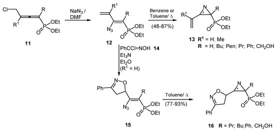 Another approach based on the treatment of phosphorylated allenes 11 with sodium azide was the basis of a convenient methodology for the synthesis of 3-vinyl- and 3-dihydroisoxazolyl-2H-azirines 13 and 16 (Scheme 4) [27,28].