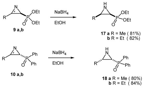 One of the earliest reported reactions of 2H-azirines bearing phosphorus substituents was hydride addition [24,25]. The treatment of azirines 9, 10 with sodium borohydride in ethanol produced cis-aziridines exclusively (Scheme 5). The stereochemical assignment was based on the large coupling constant observed for the ring protons and further established by the transformation into enantiopure cis-N-(p-toluenesulfinyl)-aziridines by treatment with (-)-(S)-menthyl p-toluenesulfinate [24].