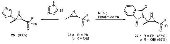 Nitrogen heterocycles, in the presence or absence of base, add regioselectively to the azirine nucleus following the general pattern – the attack being from the less hindered face of the azirine - yielding functionalized aziridines [29,30] (Scheme 7 and Scheme 8).