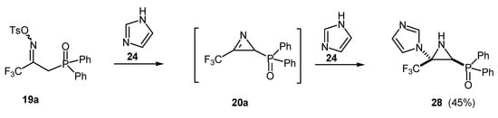 For the synthesis of β-amino-phosphine oxide and –phosphonate derivatives 22 from tosyloximes 19, a similar addition of hydride takes place with 3-fluoroalkyl-2H-azirines 20–postulated as plausible intermediates – producing regioselectively cis-aziridines 21 which then lead to compounds 22 by ring opening [29] (Scheme 6).