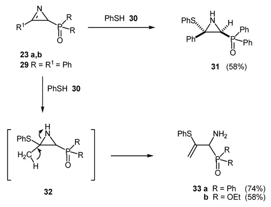 Oxygen [30] (Scheme 9) and sulfur [29] (Scheme 10) nucleophiles also add in a similar and regioselective mode, to 2H-azirines bearing phosphorus substituents. In the case of the reaction with benzenethiol, if a methyl group is present in the ring of the resulting aziridines, subsequent ring opening reaction leads to a-aminophospine oxide and –phosphonates 33.