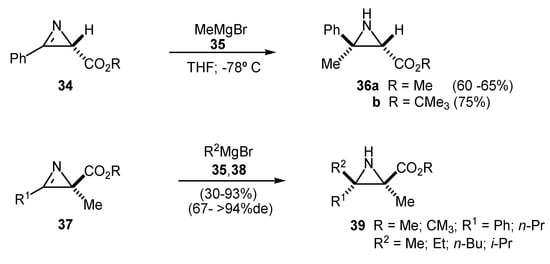 The addition of Grignard reagents to 2-phosphinyl- and 2-phosphonyl-2H-azirines is less simple. Early reports with 2,3-diphenyl-2H-azirine revealed that the reaction followed the general pattern of addition of nucleophiles, i.e., the obtained aziridines arise from the attack at the less hindered face of the azirine [31]. These findings are in clear contrast with those obtained with alkyl 2H-azirine-2-carboxylates, in which the syn addition –to the more hindered face– is preferred (Scheme 11) [32,33]. These facts have been ascribed to a prechelating effect of the Grignard reagents with carboxylate substituents.