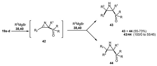 This behaviour has been ascribed to the high exocyclic dihedral angle of the saturated carbon and to the presence of a bulky tetrahedral phosphorus group. But if a chelating substituent, such as alkylfluoromethyl or perfluoroalkylmethyl is present beside the phosphorus group, the former may play a major role in the mode of addition and in the reaction outcome, as demonstrated by the production of mixtures of cis/trans aziridines 43/44 [29] (Scheme 12).