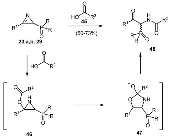 Carboxylic acids [26], N-protected aminoacids and peptide residues [34] also add to the carbon nitrogen double bond of phosphinyl- and phosphonyl-2H-azirines. The concomitant ring opening leads to ketamides 48 (Scheme 13).