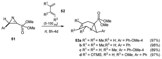 Similarly enantiomerically enriched 2H-azirine-3-phosphonates 51 when stirred with 100 equiv of 2,3-dimethylbutadiene or trans-piperylene for 2-4 days at room temperature or with Danishefsky’s diene for 8 hours, afforded bicyclic aziridines 53 as single stereoisomers in good yields [23] (Scheme 15).