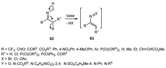 Electron-deficient nitrosoalkenes are, generally, very unstable species and for this reason, they are usually generated and intercepted in situ. Depending on the substituents, azoalkenes are sometimes stable enough to be isolated. Anyway, being isolated or generated “in situ”, the most common, general and broad scope method for the obtention of nitroso- and azo-alkenes is the base induced 1,4-dehydro elimination from oximes and hydrazones bearing a suitable halogen or ester leaving group at the α-position [1,2,4,7,10,11] (Scheme 17).