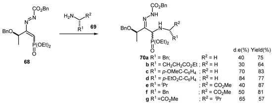 The diastereoselective addition of optically active amino esters gave slightly improved results when an optically active group was introduced at position 3 of the azoalkene. Thus the azovinylphosphonate 68 produced hydrazono derivatives 70 in good yields but moderate diastereoselectivity [46] (Scheme 19).