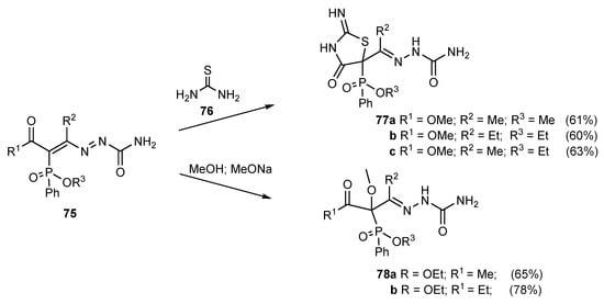Addition of thiourea and methanol to 1,2-diaza-1,3-butadienes 75.