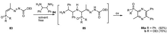 Under solvent free or solid-phase conditions, a Michael type addition of 1,2-diamines to phosphinyl- and phosphonyl-azoalkenes was observed, furnishing substituted hydrazones which subsequently were cyclised into pyridazines [50] (Scheme 23).