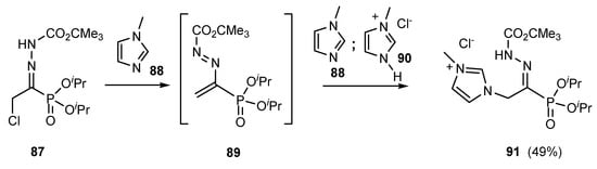 The nitrogen heteroaromatic N-methylimidazole was reported to promote dehydrohalogenation of hydrazone 87 and to add regioselectively to the azo-alkene 89, conducting to functionalized α-hydrazonophosphonate 91 [51] (Scheme 24).