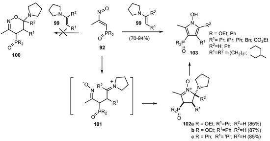 In this context, Palacios and co-workers [70] found that the reactions of nitrosoalkenes, bearing a phosphinyl or phosphonyl substituent at the terminal carbon, with enamines 99 did not proceed by [4+2] cycloaddition reactions producing the expected 1,2-oxazines, but N-hydroxypyrroles were instead isolated, presumably by a mechanism involving an initial conjugate addition of the enamine followed by a formal [3+2] dipolar cycloaddition (Scheme 26).