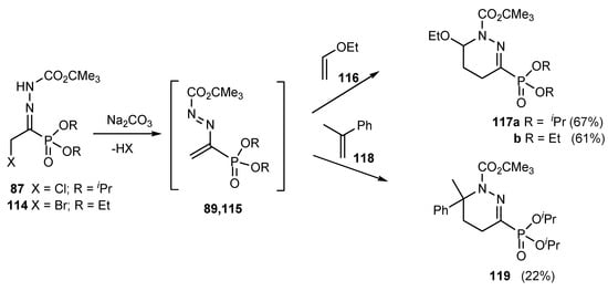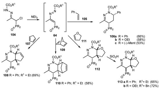 Azoalkenes with a phosphinyl or phosphonyl substituent at the 4-position were generated by triethylamine induced dehydrohalogenation of chlorohydrazones [71]. Its interception with acyclic— styrene and cyclic—cyclopentadiene and norbornadiene alkenes and di-hydrofuran gave regio- and stereo-selectivelly endo cycloadducts, except in the case of the strained norbornadiene, which produced an exo cycloadduct (Scheme 27).