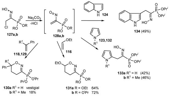 Nitrosovinylphosphonates generated from the corresponding chlorooximes were intercepted by electron-rich alkenes and heterocycles [74]. The yields, although not optimised, were fair and the reactions were found to be completely regioselective: no other isomers were detected or isolated from the reaction medium (Scheme 29).