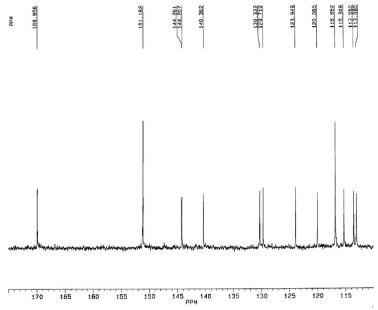A significative region of the 13C-NMR spectrum of the new synthesized 3,5-di-O-acetyl piceatannol (5a) is shown in Figure 4. The presence of the catecholic moiety in the B-ring of 3,5-di-O-acetyl piceatannol (5a) was confirmed by analyzing this spectroscopic region, which showed the lack of symmetry of the B-ring, two quaternary carbon atoms (C-3’ and C-4’) at 140.4 and 144.2 ppm and three C-H carbons (C-2’, C-5’, C-5’) at 113.5, 115.3 and 116.8 ppm, respectively.