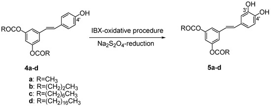 On the basis of the good results, this simple efficient and useful synthetic procedure was applied to 3,5,4’-tri-O-butanoyl resveratrol (4b); 3,5,4’-tri-O-octanoyl resveratrol (4c) and 3,5,4’-tri-O-palmitoyl resveratrol (4d) (Scheme 2). The corresponding lipophilic piceatannol derivatives 5b-d were isolated in satisfactory yields (Table 2, entry 1-3) and with a high degree of purity.
