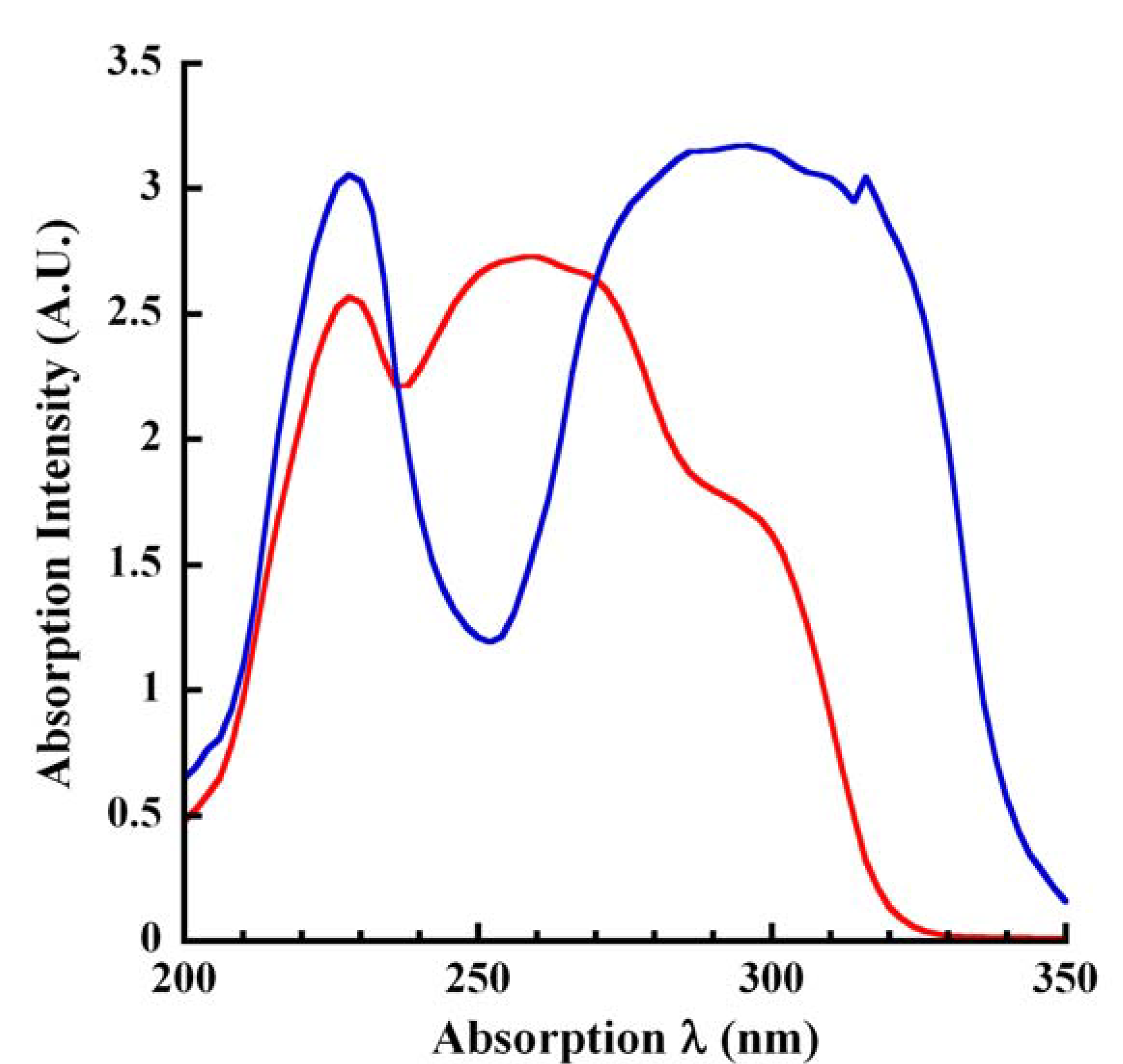 Absorption spectra of unmodified CA. The absorption of CA (100 μL Vt; 250 μM final) was measured at ~25 °C under acidic (citrate buffer, pH 4.5; red tracing) and basic (250 mM KOH; blue tracing) pH conditions in a 96-well UV-transparent microplate. Absorption was scanned over the wavelength range of 200 to 350 nm in 2 nm intervals. Absorption profiles were corrected for background from the vehicle (pH 4.5 buffer or 250 mM KOH).