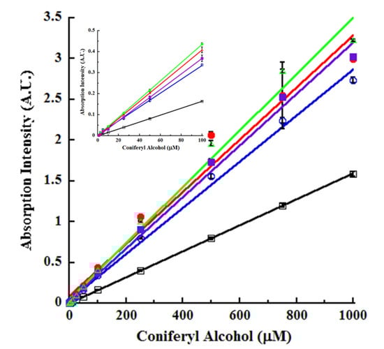 21]. These wavelengths are close to one of the major absorption peaks of CA and likely to interfere in the measurements of different monolignols. On the other hand, the flexibility of the several absorption wavelengths identified in this paper offers a way to eliminate or minimize these interferences.