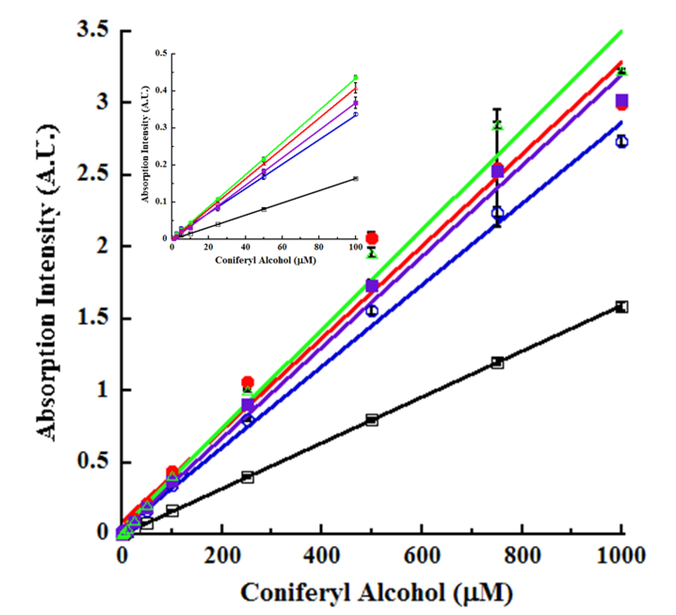 A choice of several absorption wavelengths under acidic and basic reaction conditions offers multiple interrogation opportunities for unknown samples, thus improving sensitivity and specificity [19]. Furthermore, our data offers an explanation for the choice of wavelengths employed to detect and quantify native, unmodified CA. Previously, p-CA and SA were measured using the absorption wavelengths of 260 and 270 nm [21]. These wavelengths are close to one of the major absorption peaks of CA and likely to interfere in the measurements of different monolignols. On the other hand, the flexibility of the several absorption wavelengths identified in this paper offers a way to eliminate or minimize these interferences.