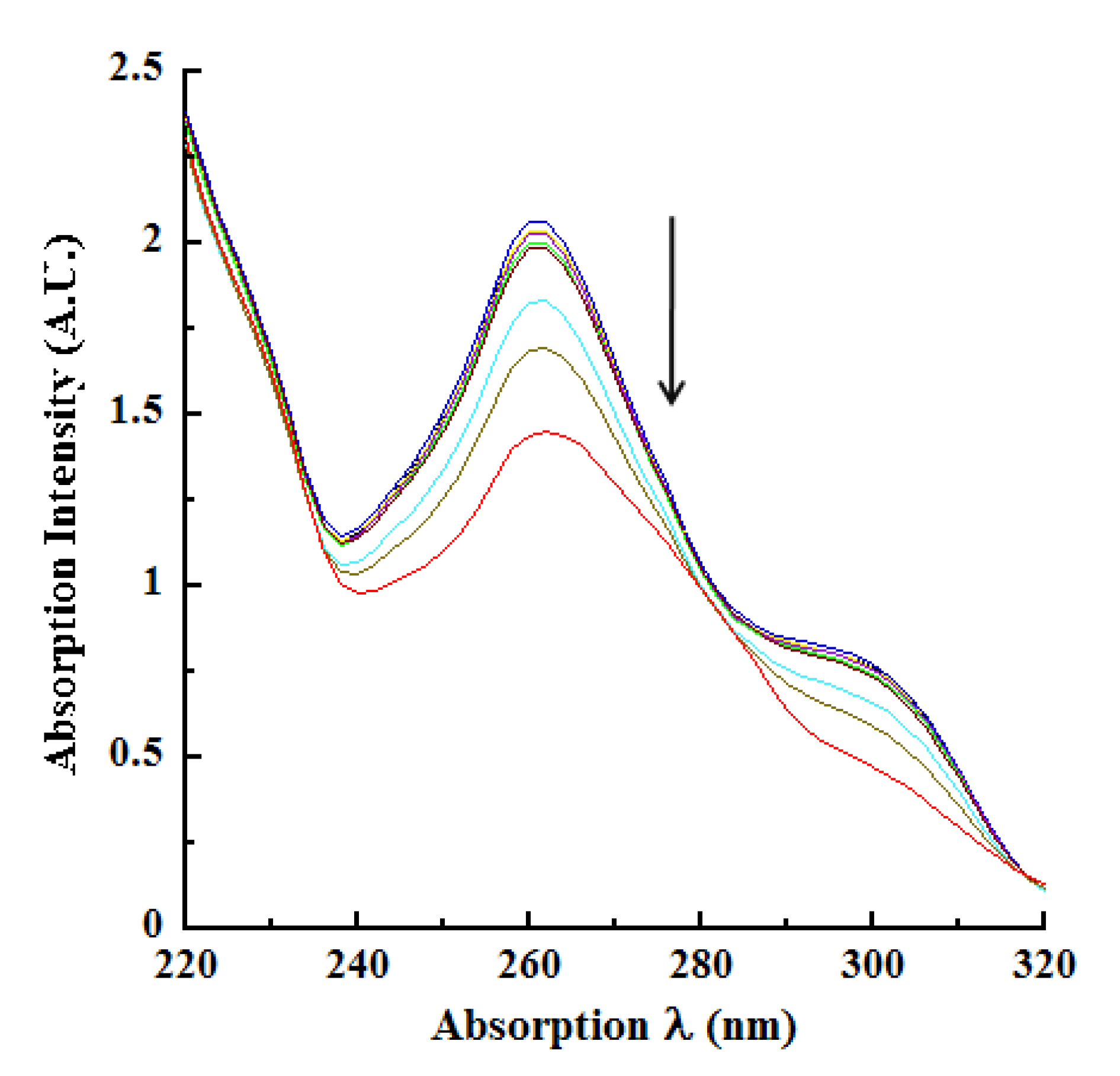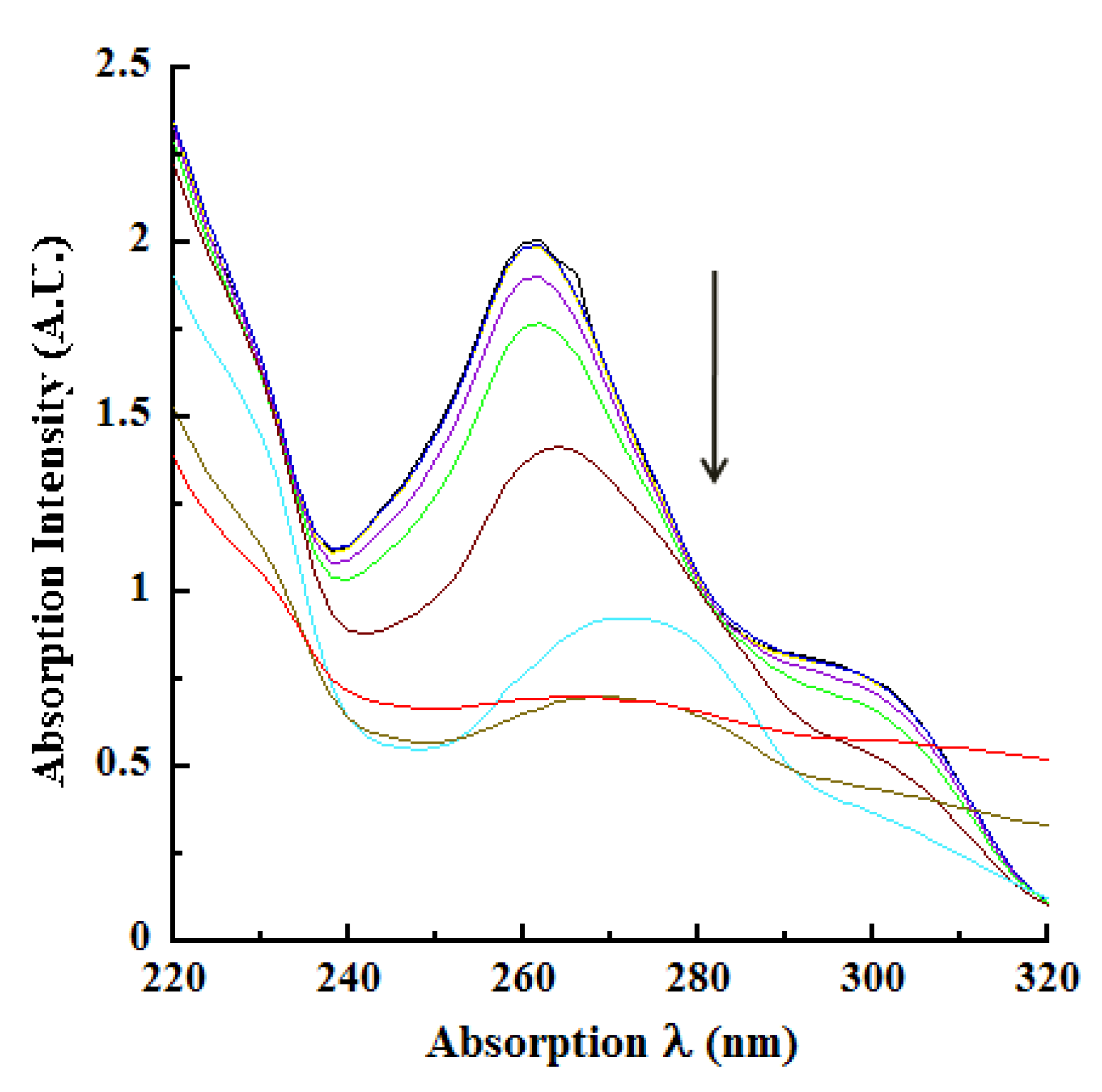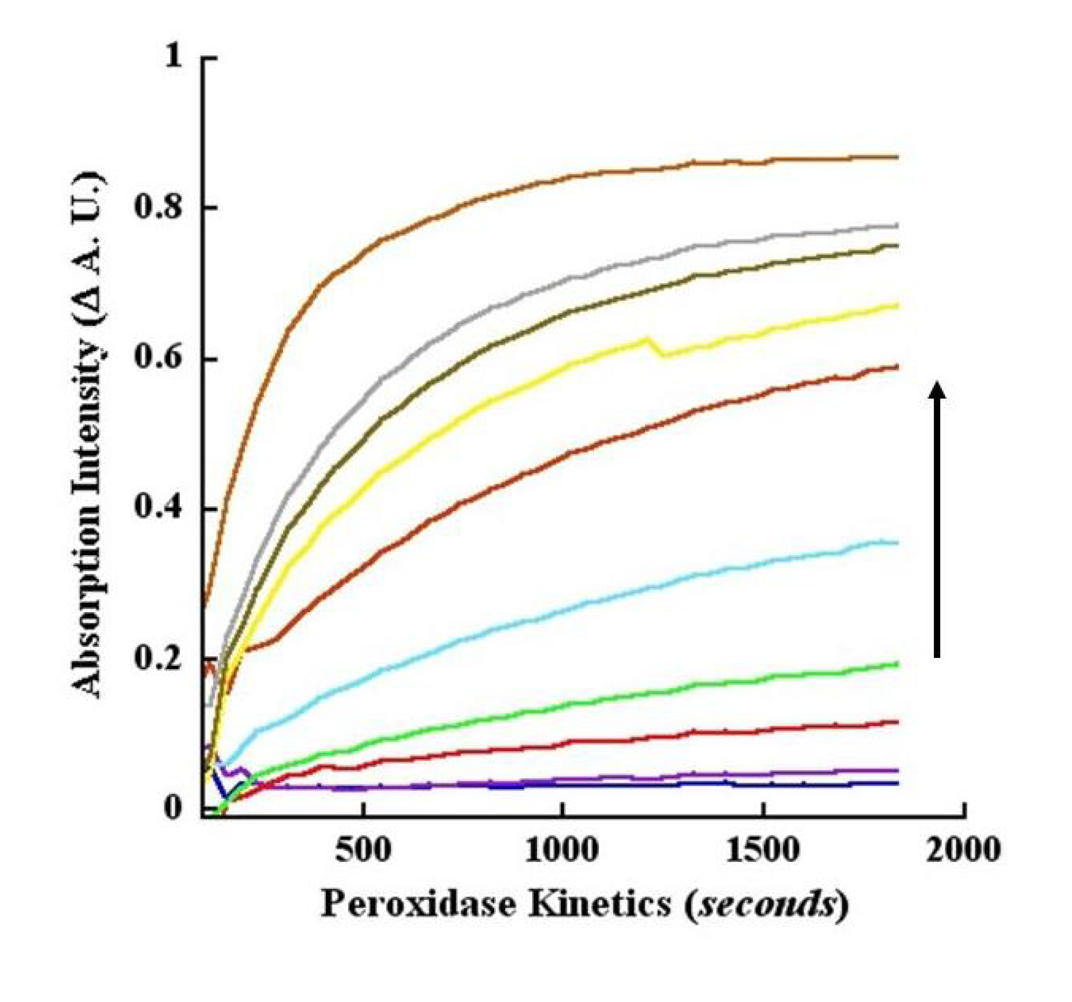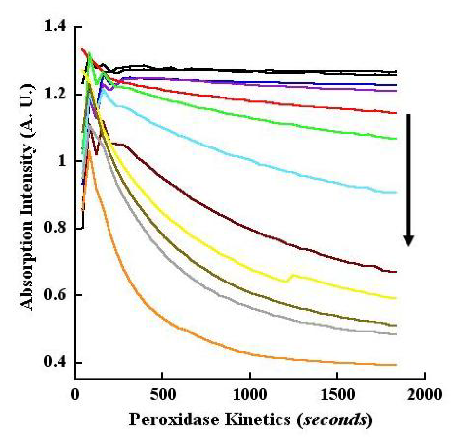 Kinetics of peroxidase oxidation of CA monitored at 260 nm. Increasing concentrations of peroxidase-catalyzed oxidation of CA was monitored at 260 nm in kinetic mode (pH 4.5 buffer). Absorption changes over time and with different concentrations of the enzyme are represented by the various colored tracings with progressively decreasing intensities as indicated by the downward pointing arrow. The concentrations (ng/mL) of the peroxidase were: 1.0 (blue), 2.5 (purple), 5 (red), 10 (green), 20 (aqua), 40 (magenta), 60 (yellow), 80 (brown), 100 (gray) and 200 (orange). The top two black tracings that are nearly parallel to the abscissa represent control reactions without enzyme and without H2O2, respectively.