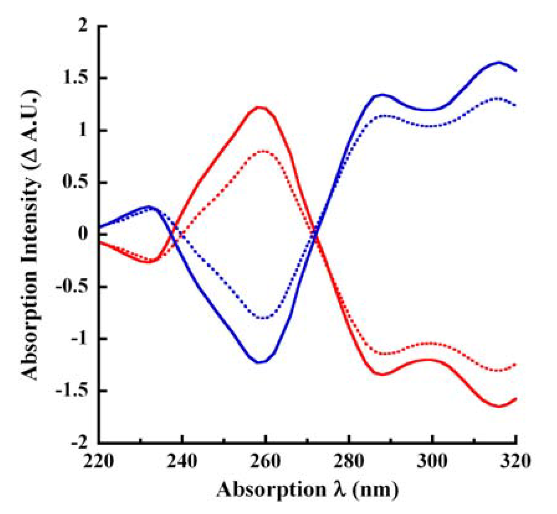 Difference spectroscopy of CA. Subtractive absorption profiles of unmodified CA in pH 4.5 buffer or in 250 mM KOH and profiles of 0.1 μg/mL laccase-oxidized CA in pH 4.5 buffer (57 minutes) or in 250 mM KOH (60 minutes) are shown here. The solid red tracing represents the absorption of unmodified CA measured in pH 4.5 buffer subtracted from the absorption in 250 mM KOH. The solid blue tracing represents the absorption of unmodified CA taken in 250 mM KOH subtracted from its absorption in pH 4.5 buffer. The dotted red tracing is the profile of laccase-oxidized CA in pH 4.5 buffer subtracted from its absorption in 250 mM KOH. Finally, the dotted blue tracing is the absorption of laccase-oxidized CA reactions terminated with 250 mM KOH subtracted from its absorption in pH 4.5 buffer.