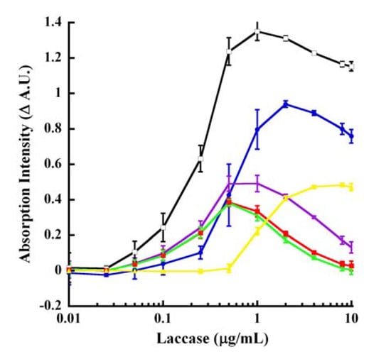 Figure 6B). Both reactions saturated between 0.5 and 1 μg/mL laccase. The highest Δ A.U. was noted at 260 nm (pH 4.5 kinetic reactions), whereas nearly equal and high Δ A.U. values were observed at 288, 310 and 320 nm in endpoint mode. These reactions could also be monitored in a