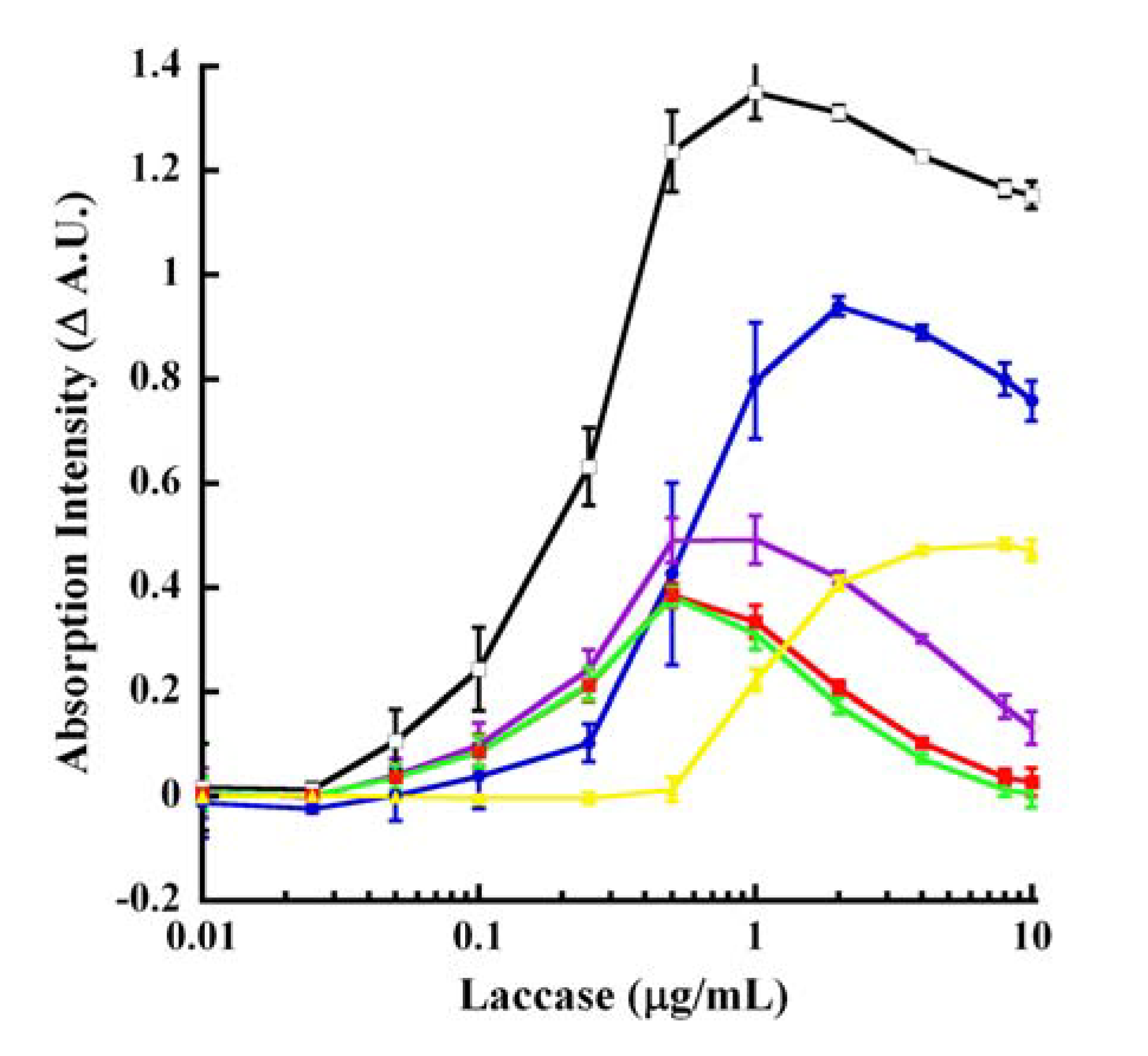 Progress curves for laccase oxidation of CA. Increasing concentrations of laccase were reacted with 500 μM CA for the indicated time-periods. The absorption at 260 nm was measured and the difference in the intensities between reactions without the enzyme and with the enzyme was recorded (B−S). Reactions were carried out in kinetic mode (citrate buffer, pH 4.5). The various colored tracings represent the following concentrations of laccase ( μg/mL): 0.01 (black), 0.025 (blue), 0.05 (purple), 0.10 (red), 0.25 (green), 0.50 (aqua), 1.00 (magenta) and 2.00 (yellow). The linearity values of the correlation of coefficient (r2) for 0.05, 0.1, 0.25 and 0.5 μg/mL laccase were 0.99783, 0.99789, 0.99829 and 0.96606, respectively.