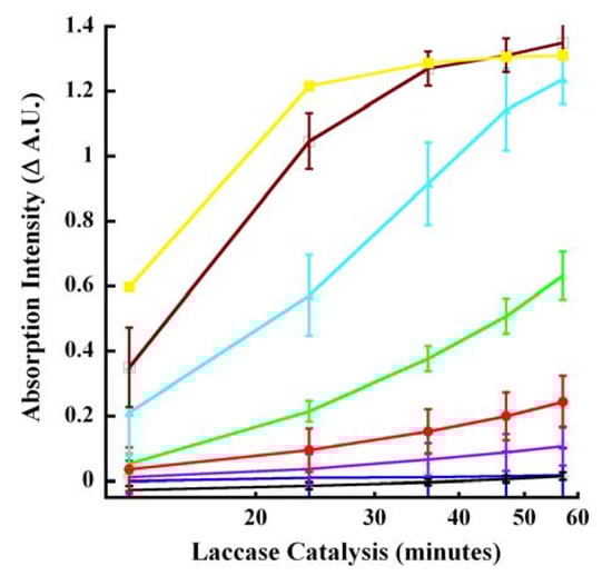 Figure 3B. The tracings represent reactions in the absence of laccase (0 μg/mL; black) and the eight concentrations of laccase listed in