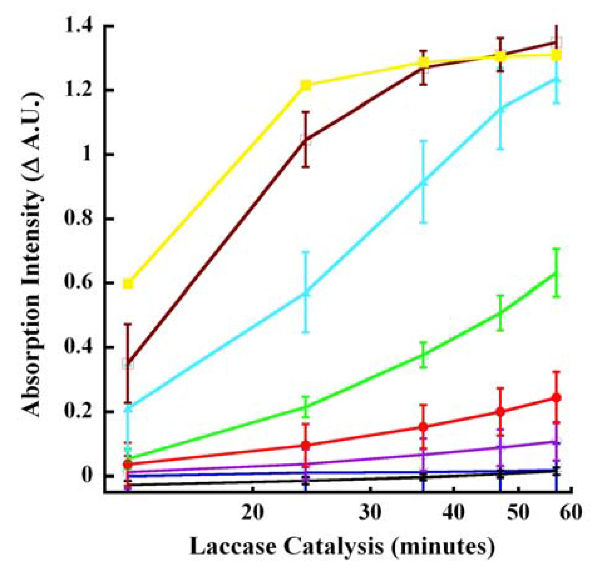 Predictably, signal discrimination (hypochromicity) became magnified between catalysis times of 13 and 57 minutes. Excellent linearity (r2 ≥ 0.97) was observed especially over an order of magnitude of laccase concentrations 0.05 and 0.5 μg/mL (Figure 7). The lower limits of laccase detected using CA as substrate was 10ng/mL enzyme. Depending on the enzyme concentration, CA oxidation could be detected within 10 minutes. This was in contrast to the extended reaction periods used previously, some lasting up to 4 hours [13].