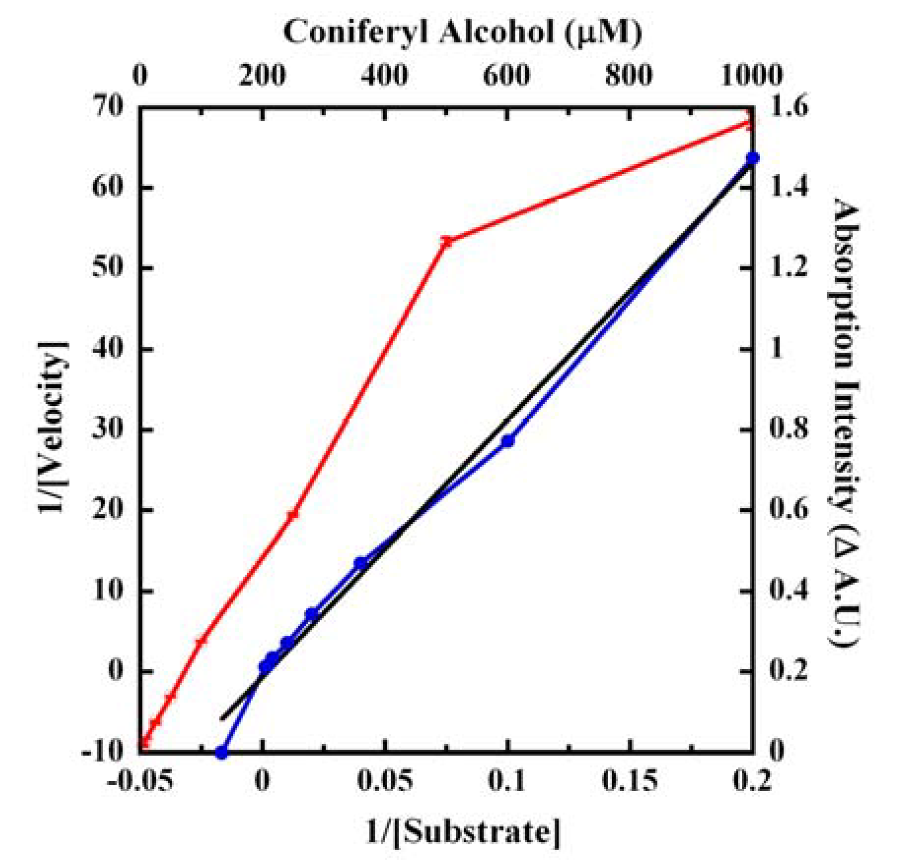 Affinity of CA for laccase. Increasing concentrations of CA were reacted with 1.0 μg/mL laccase for 30 minutes at 25 °C and the absorption at 260 nm was monitored. The open circles (red tracing) represents the Δ A.U. of (B−S) (right ordinate) plotted as a function of CA concentrations (top abscissa). The Lineweaver-Burk transformation of this data is shown as the blue tracing (closed circles) corresponding to the lower abscissa (1/Substrate) and the left ordinate (1/Velocity). The linear curve fit (black tracing) of the transformation is shown along the same axes and the r2 was 0.99192.