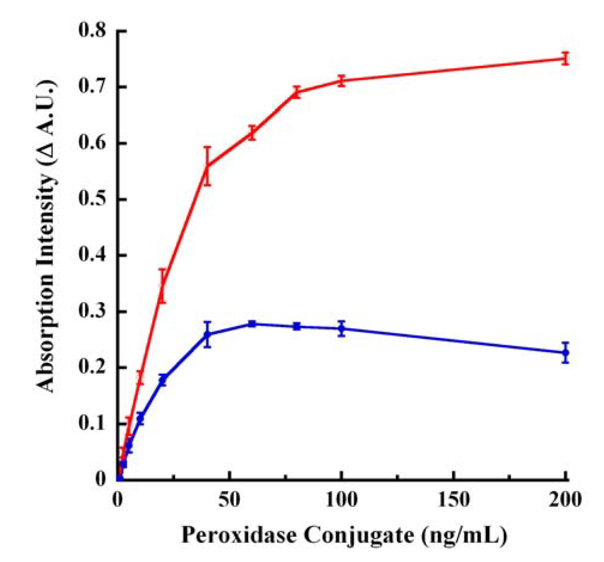 Peroxidase dose-response tracings for CA endpoint mode oxidation. Increasing and indicated concentrations of peroxidase conjugate were reacted with CA for 30 minutes at ~25 °C in 96-well UV-Vis microplate. The reaction was stopped by adding 100 mM NaOH. The red tracing represents Δ A.U. obtained from B−S absorption at 295 nm. The blue tracing represents Δ A.U. obtained from S−B absorption values of 260 nm.