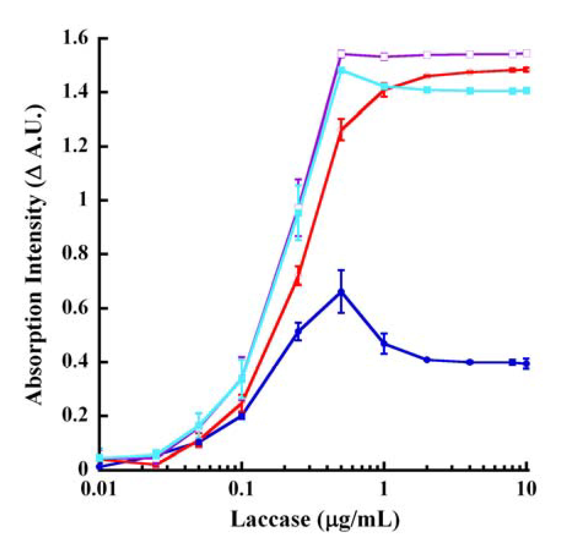 Endpoint laccase dose-response of CA oxidation. Laccase reactions (from Figure 6A) were terminated at 60 minutes with 250mM KOH. The tracings represent the absorption wavelengths of 250 nm (blue), 290 nm (red), 310 nm (purple) and 320 nm (aqua). All tracings represent the difference between the absorption intensities of the reactions without enzyme subtracted from the absorption intensities of reactions in the presence of laccase (B−S), except for 250 nm which is the discrimination between the signal (with laccase) and the background (without laccase) (S−B).