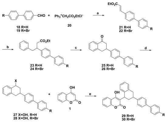 The Ferreira group [20] has developed to a new protocol for the synthesis of diphenacoum (29) and brodifacoum (30). The key step involves the stereospecific formation of one of the crucial bonds in the molecular backbone using asymmetric organocopper 1,4-addition to chiral imides. Wittig condensation of freshly prepared aldehydes 18, 19, and (carbethoxy)triphenylphosphonium chloride (20) in the presence of sodium methoxide in DMF gave the biphenyl esters 21, 22 in 92% and 87% yield, respectively. Organocopper methodology was then successfully applied to the synthesis of butanoate. 1,4-Michael addition with compounds 21, 22 and BnCu-TMEDA complex in the presence of TMS-Cl generated 23, 24 in 84% and 81% yield, respectively, and then subsequent ring cyclization by using AlCl3 in toluene to give tetralones 25 and 26 in 88% and 86% yield, respectively. The coupling reaction between 4-hydroxycoumarin 1 and secondary alcohol 27 or brominated compound 28 under an HCl atmosphere at 160 °C 30 min provided approximately equal quantities of the cis and trans isomers of 4-hydroxycoumarin derivatives 29 and 30 in 78% and 74% yield, respectively (Scheme 3).