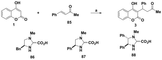 The Jorgensen group [31] reported a highly economical organocatalytic asymmetric 1,4-Michael addition of 4-hydroxycoumarin and α,β–unsaturated ketones to generate the widely used anticoagulants warfarin (Coumadin) and some related important compounds (Scheme 11). They attempted enantioselective 1,4-Michael addition by using well known benzylideneacetophenone (85) and 4-hydroxycoumarin (1) in the presence of optically active imidazolidine catalysts 86-88 to afford enantiopure warfarin moieties with 47 to 82% ee values in 22 to 96% yields. This asymmetric one-step method could be useful for the formation of a number of biologically active compounds.